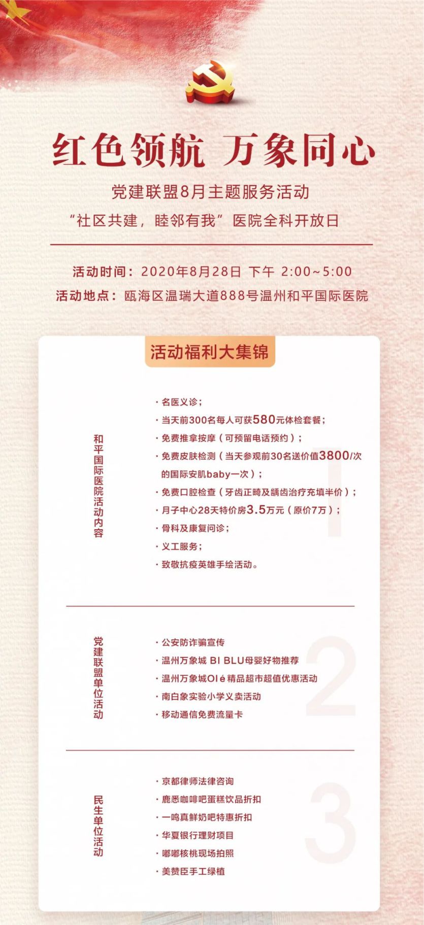 8月28日,甌海區(qū)南白象街道“紅色領(lǐng)航 萬象同心”黨建聯(lián)盟聯(lián)合多方力量,將在和平國際醫(yī)院舉行全科開放日活動,現(xiàn)場有近20家黨建聯(lián)盟單位及愛心商家,共計(jì)提供30多項(xiàng)福利,寓教于樂,縱享精彩。